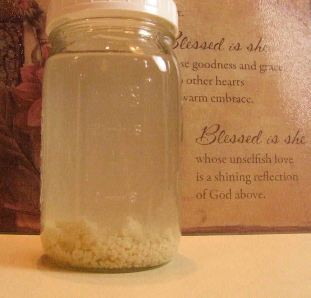 Here you can see my kefir grains have been busy turning this milk into a thick kefir. They tend to float up toward the top.
